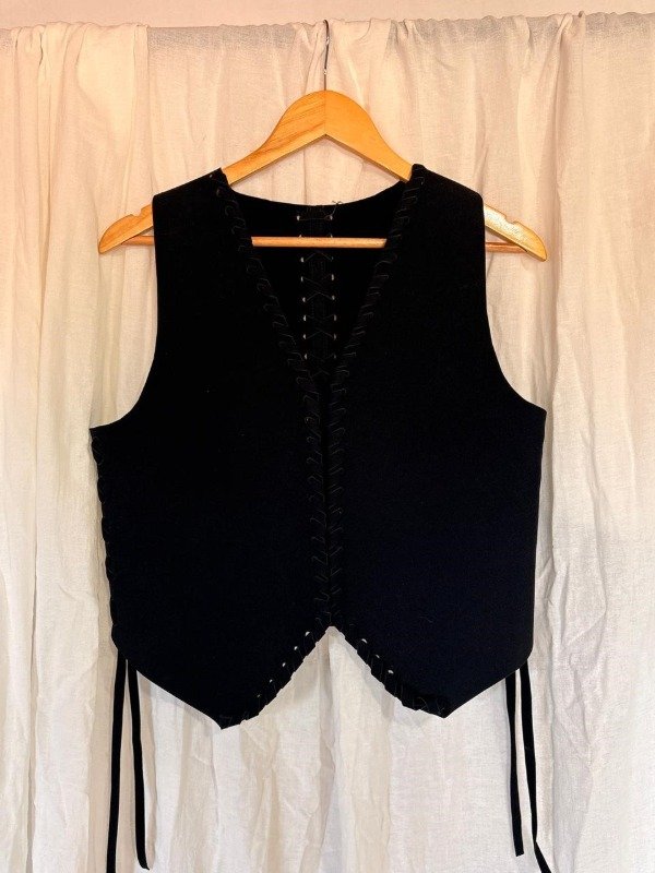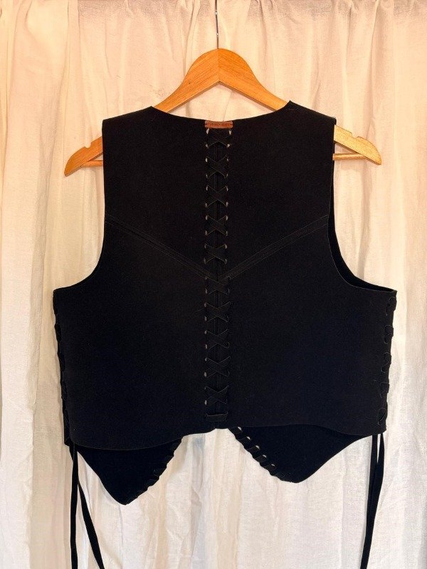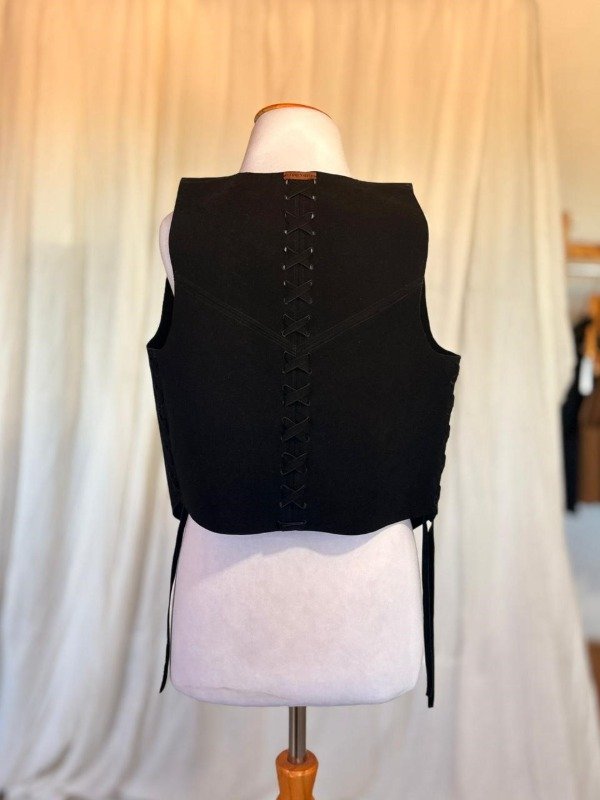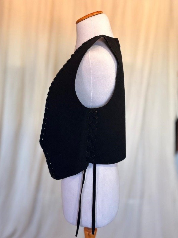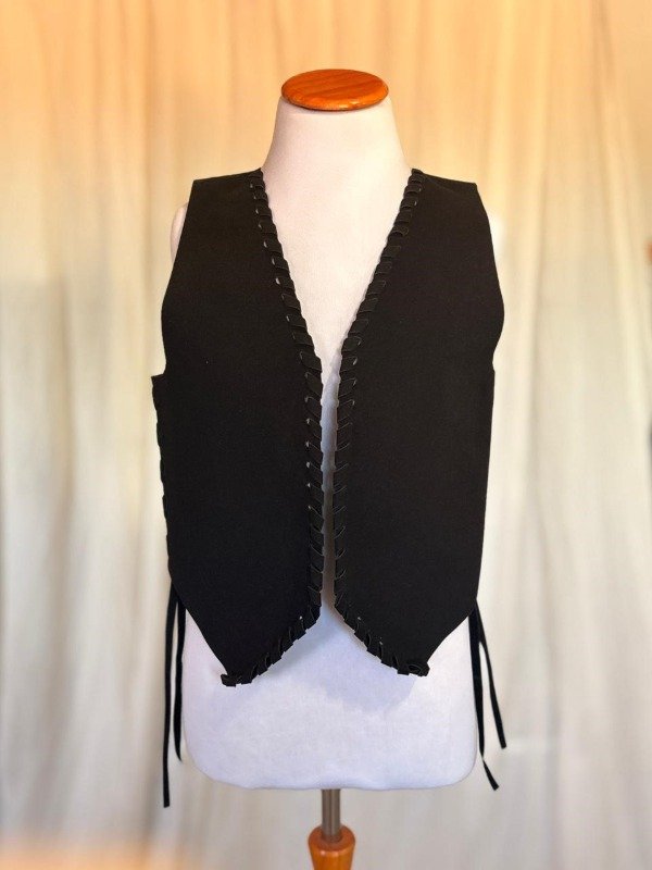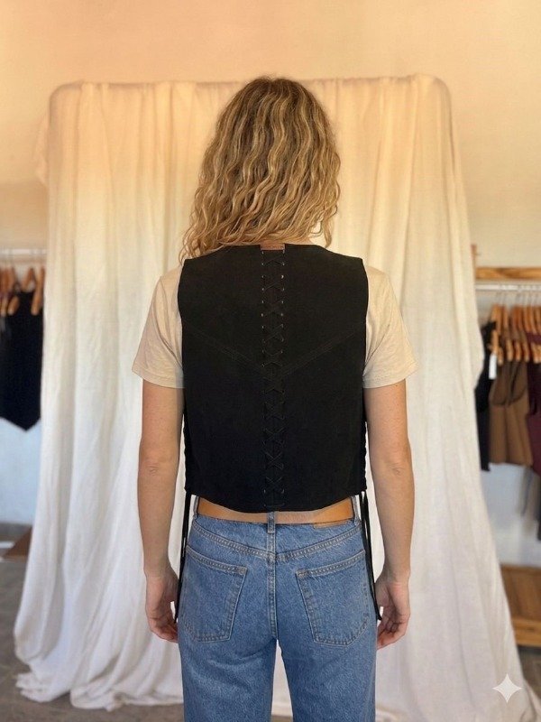 De lineas simples y calce relajado, el chaleco Indiana, está confeccionado en símil gamuza (tacto suave), con terminaciones caladas y entrelazadas a mano que recorren todo el contorno. En la espalda, un trenzado que recorre la espalda de manera sutil y aporta fuerza, elevando la prenda desde lo simple hacia lo especial.
