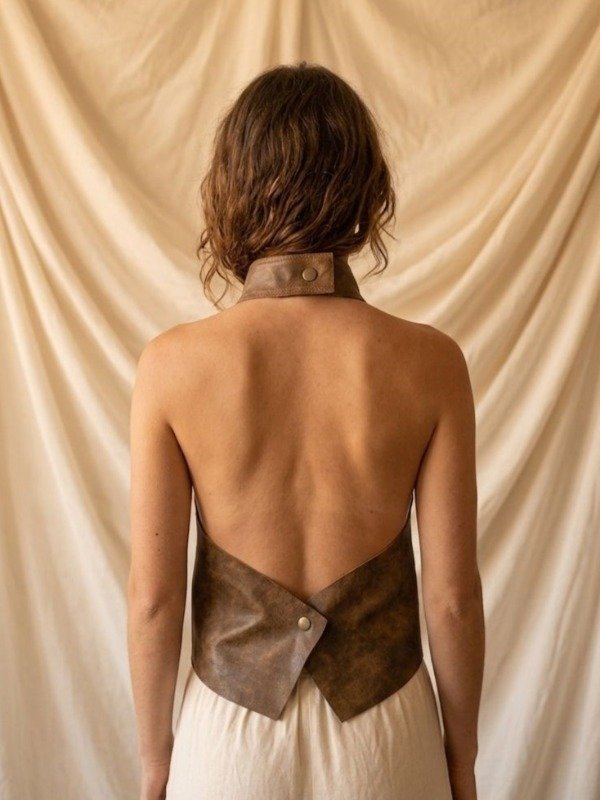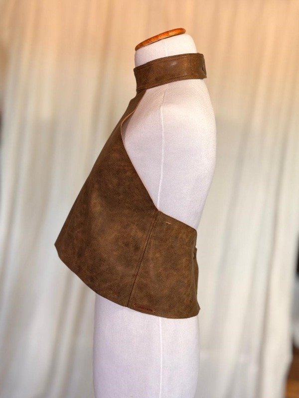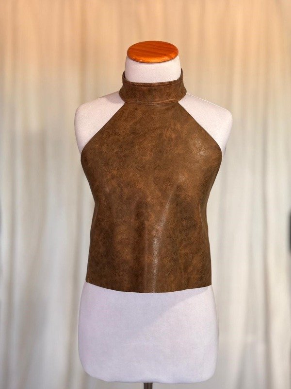 Una pieza elegate y versátil, el top Solina, está confeccionado en símil cuero nobuckado (tacto suave y brillo muy sutil). Su diseño sin mangas y cuello alto tipo tortuga le da un look moderno y sofisticado.